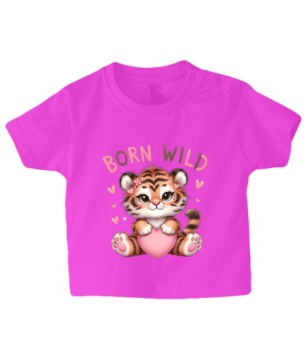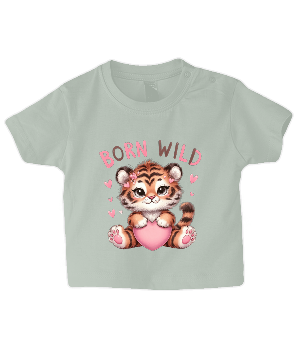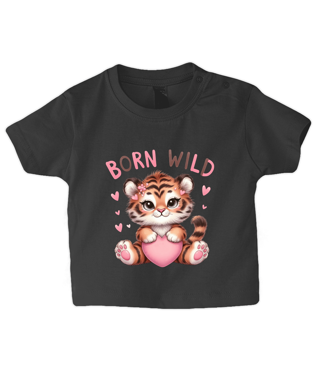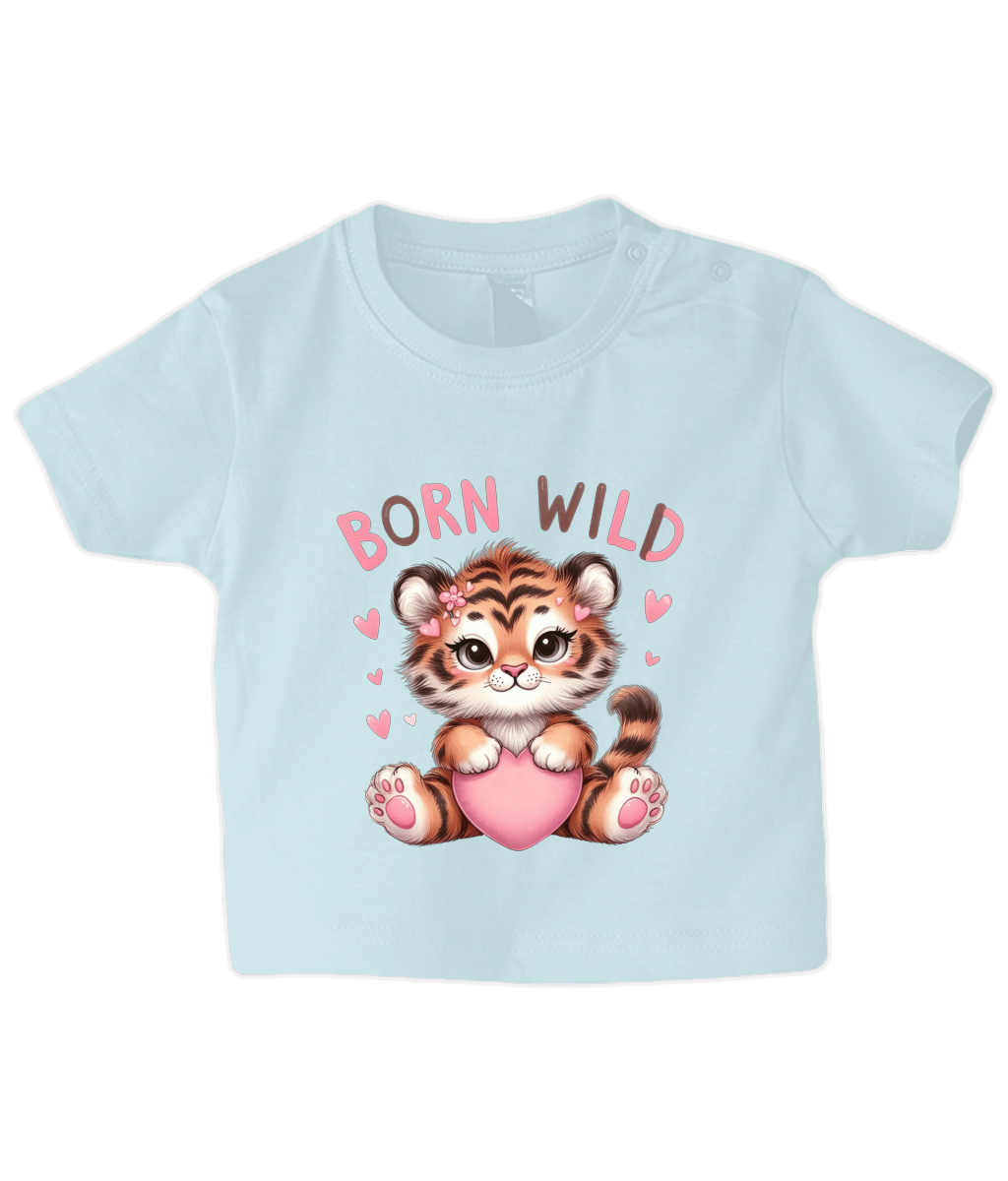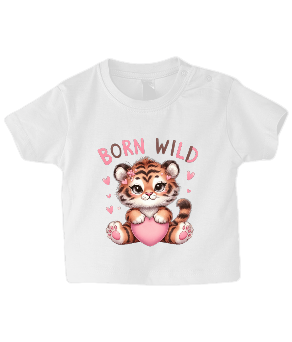 Introducing the Born Wild BabyBugz Baby T-Shirt, a delightful addition to your little one's wardrobe that perfectly captures the spirit of adventure and playfulness. Crafted from soft, breathable cotton, this t-shirt ensures all-day comfort for your baby, whether they're crawling, playing, or napping. The charming design features an adorable baby tiger graphic alongside the bold phrase "Born Wild," making it a fun and eye-catching piece that celebrates your child's untamed spirit.