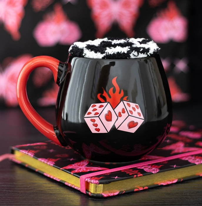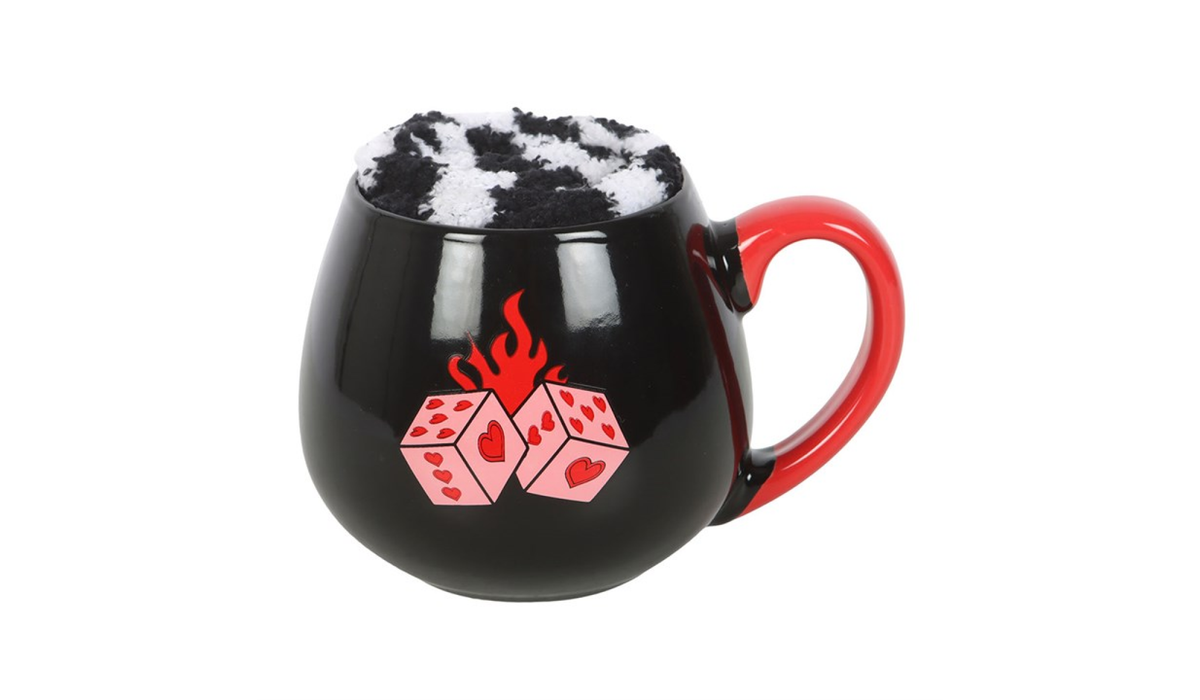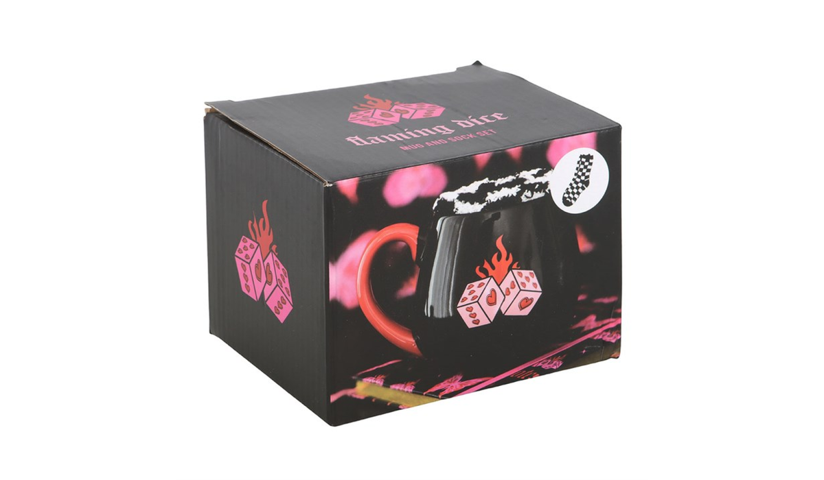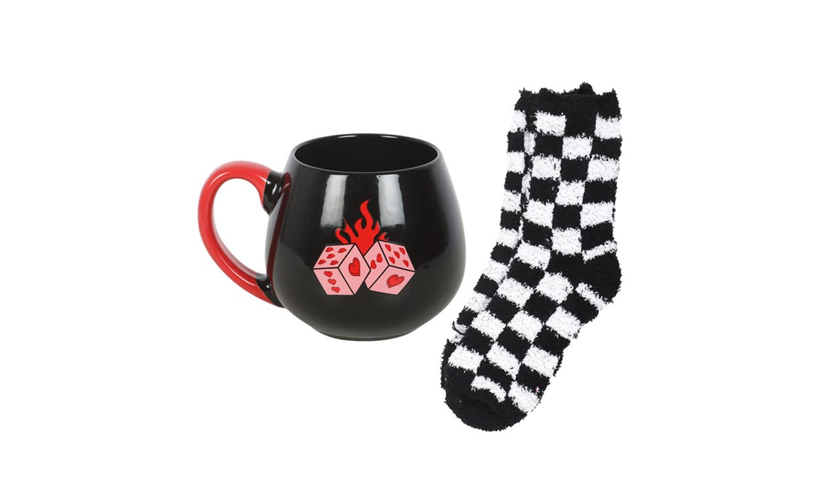 Wrap up in comfort with this cosy gift set featuring a flaming dice mug paired with super soft checkerboard socks. Ideal for chilled nights in or as a quirky gift for lovers of all things alternative and fun.