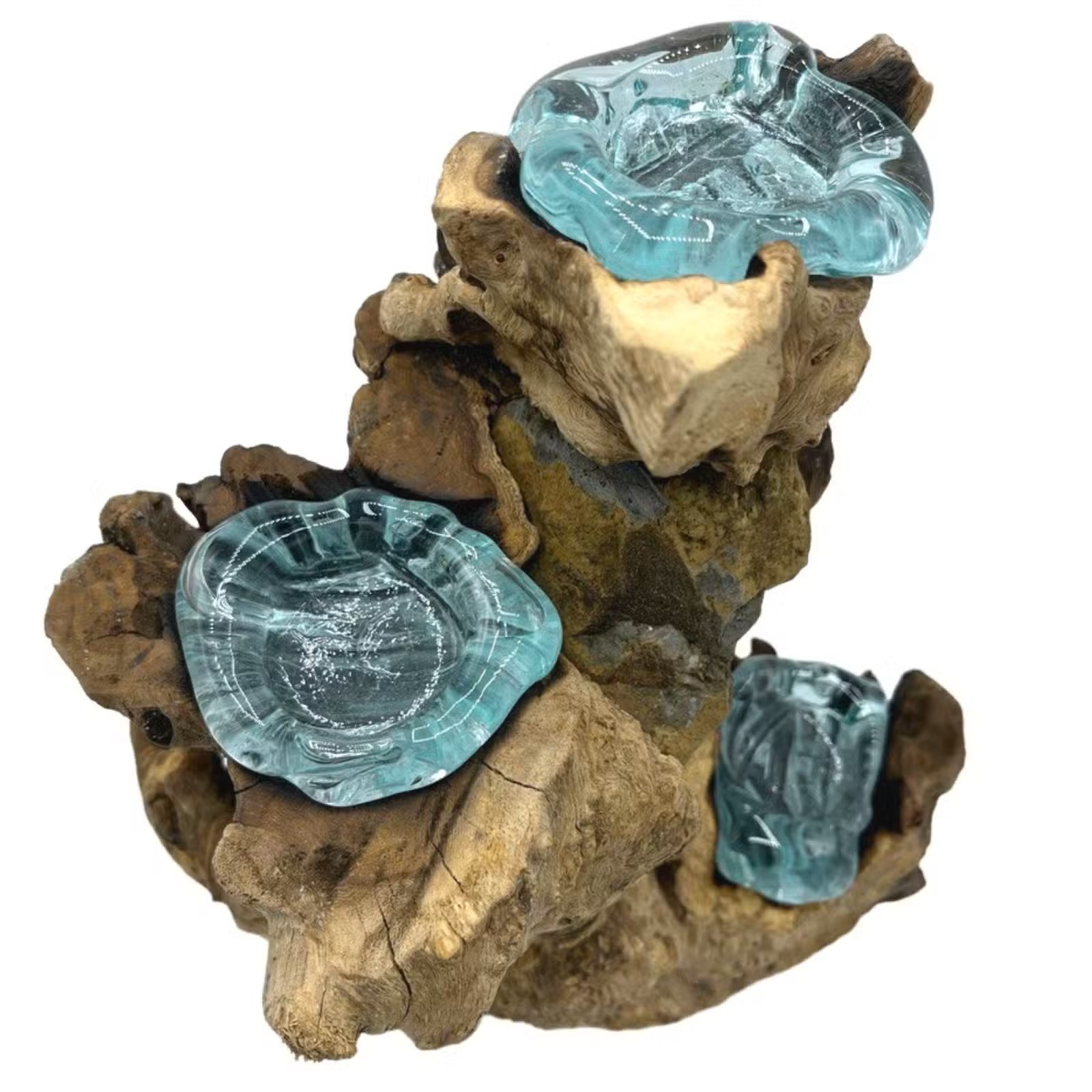 Handcrafted triple candle holder, each one features molten glass hand-poured onto reclaimed teak wood by Balinese artisans, every piece is unique, combining natural wood with flowing glass to create a functional work of art perfect for ambient lighting with tealight candles.