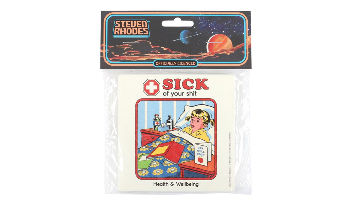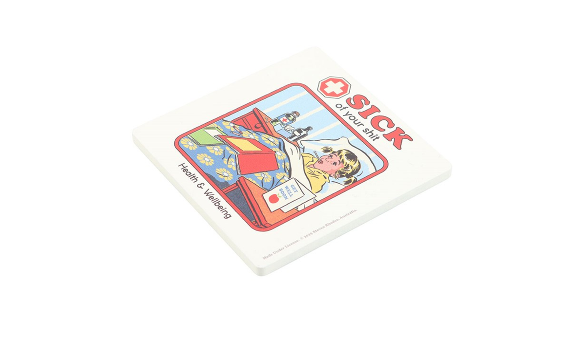 Designed with a playful yet edgy aesthetic, the Sick of Your Sh*t Coaster features vibrant artwork by the renowned Steven Rhodes, known for his unique blend of nostalgia and dark humor. The bold graphics and witty phrase make it an eye-catching conversation starter, ensuring that your guests will take notice. It’s not just a coaster; it’s a reflection of your personality and a perfect way to express your feelings without saying a word. Plus, it’s officially licensed, so you can trust that you’re getting an authentic piece of art that stands out in any setting.