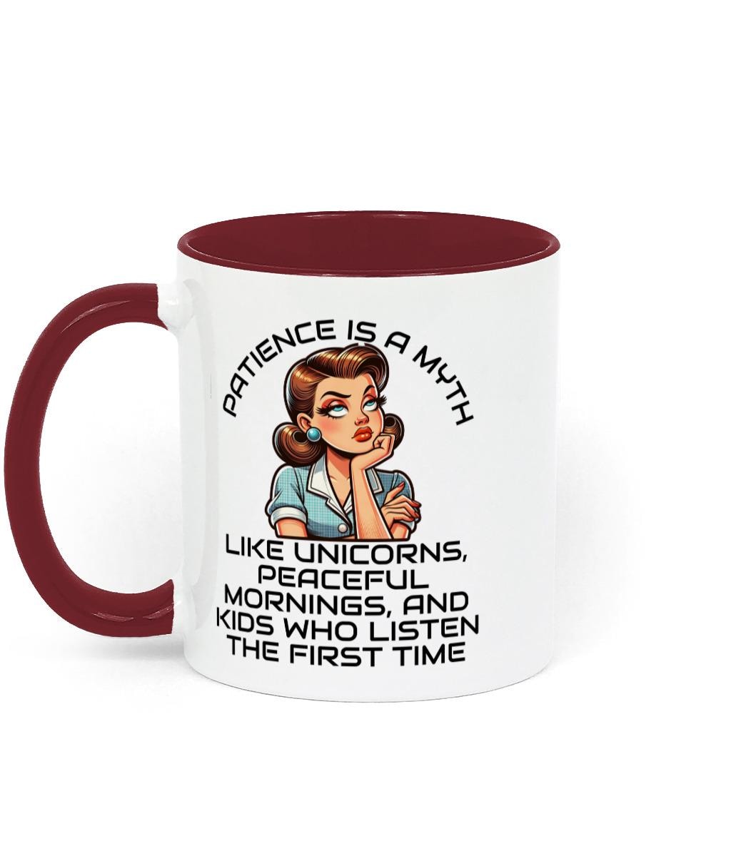 Discover the perfect blend of sass and charm with our Two Toned Retro Sarcastic Ceramic Mug, featuring the playful yet relatable phrase, "Patience is a Myth." This mug isn't just another drinkware item; it's a conversation starter, a gentle reminder, and an ideal gift for those special women in your life—be it for Mother's Day, birthdays, or just because! Crafted from high-quality, glossy ceramic, this 11 oz masterpiece boasts a bright white finish complemented by a colorful handle and inner rim, making it both stylish and functional. It's as delightful to the eyes as it is practical, being dishwasher and microwave safe for hassle-free enjoyment.  Imagine sipping your morning coffee or tea while embracing your fabulous, impatient self! Treat yourself or surprise that extraordinary mum, sister, or friend with a gift that truly resonates. Grab your Two Toned Retro Sarcastic Mug today and let the world know that patience? Well, that's just a myth! - 11 oz glossy ceramic. - Bright white glossy finish with a coloured handle and inner rim. - Dishwasher & Microwave safe.