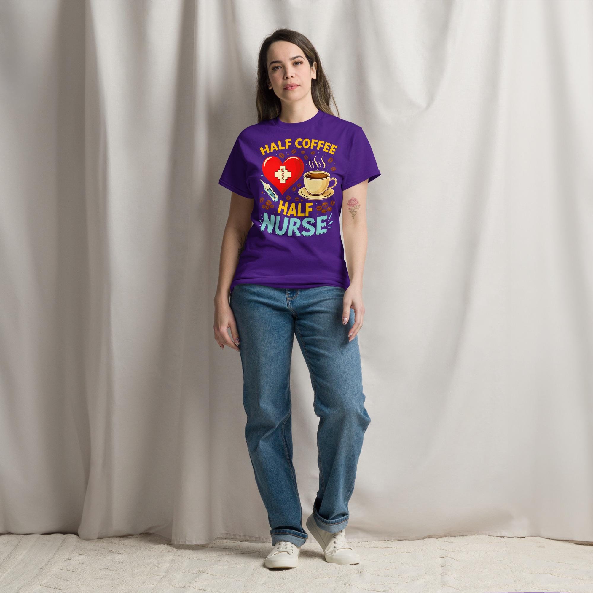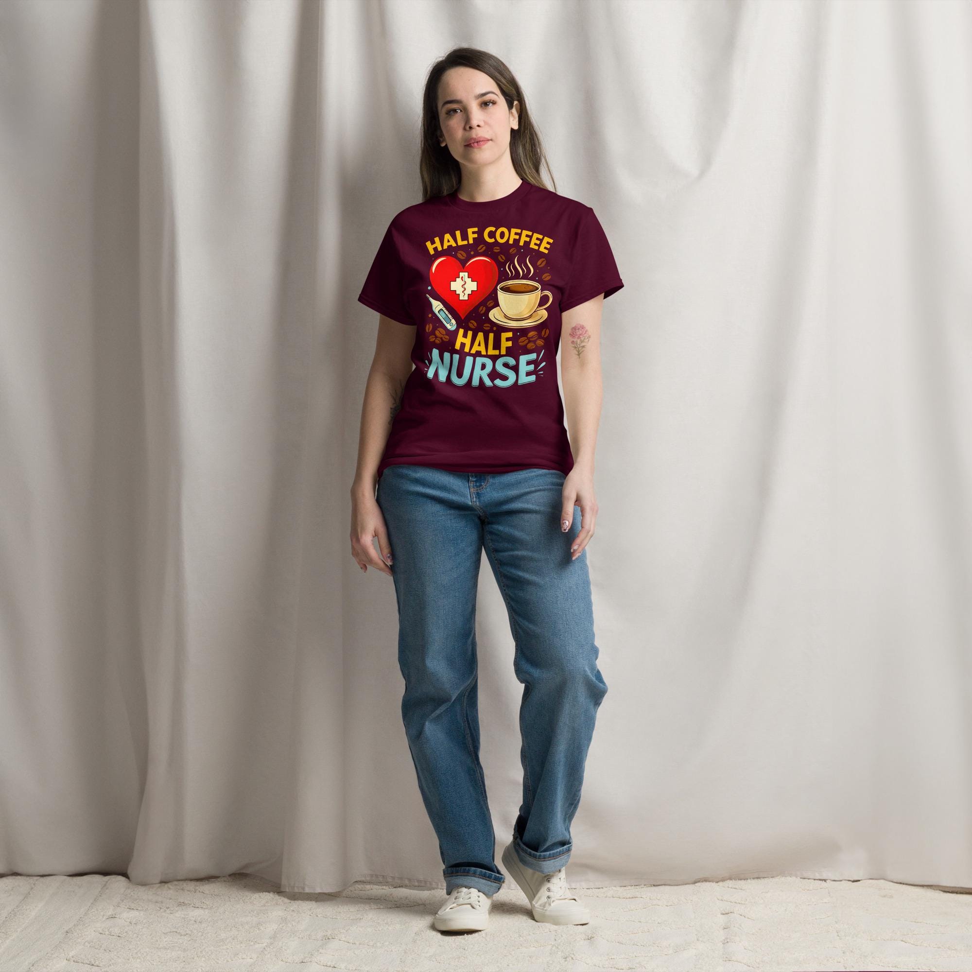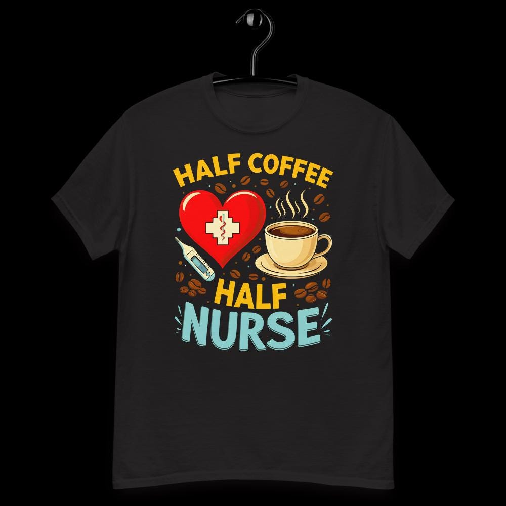 Our Unisex classic Nurses Fun T-Shirt featuring half coffee half nurse